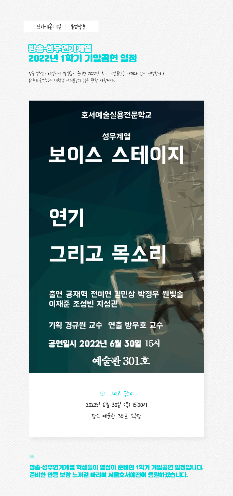 방송·성우연기계열 학생들이 열심히 준비한 1학기 기말공연 일정입니다. 준비한 만큼 보람 느끼길 바라며 서울호서예전이 응원하겠습니다.