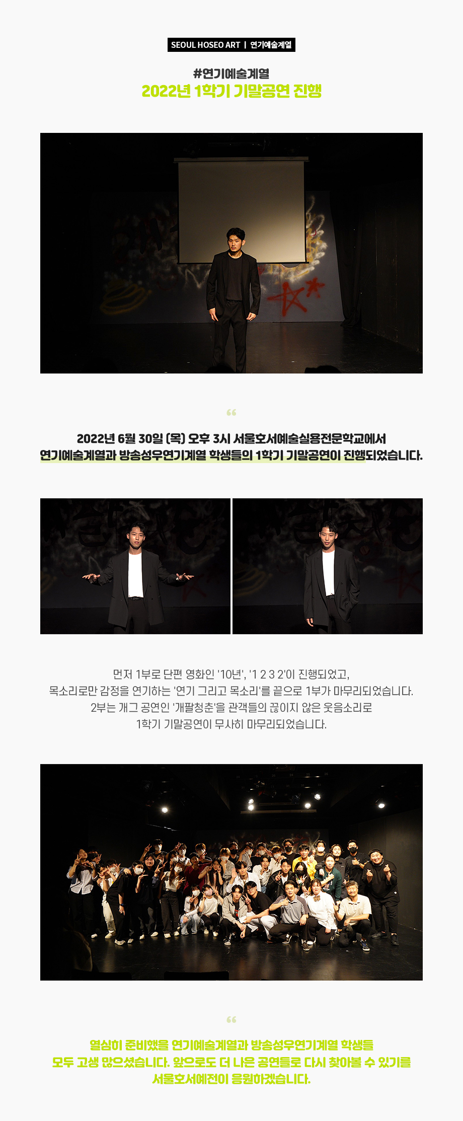 2022년 6월 30일 (목) 오후 3시 서울호서예술실용전문학교에서 연기예술계열과 방송성우연기계열 학생들의 1학기 기말공연이 진행되었습니다. 먼저 1부로 단편 영화인 '10년', '1 2 3 2'이 진행되었고, 목소리로만 감정을 연기하는 '연기 그리고 목소리'를 끝으로 1부가 마무리되었습니다.