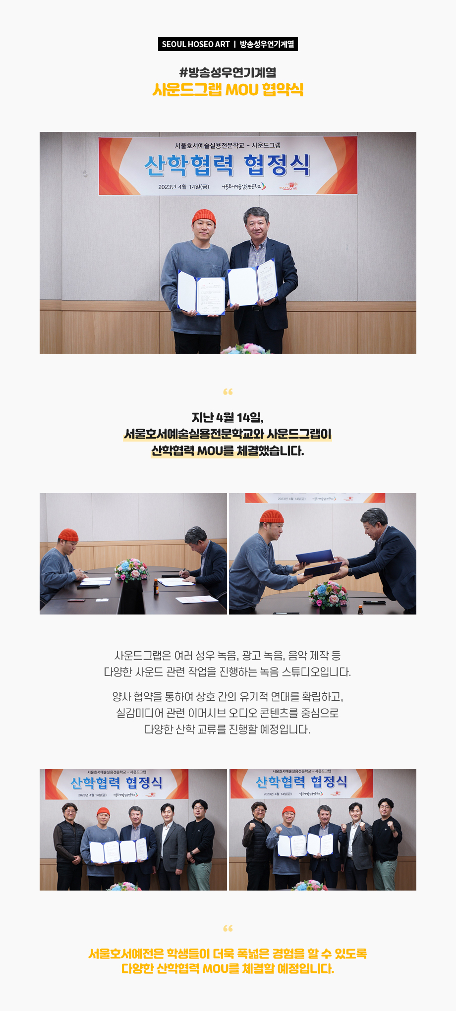지난 4월 14일, 서울호서예술실용전문학교와 사운드그랩이 산학협력 MOU를 체결했습니다. 사운드그랩은 여러 성우 녹음, 광고 녹음, 음악 제작 등 다양한 사운드 관련 작업을 진행하는 녹음 스튜디오입니다.