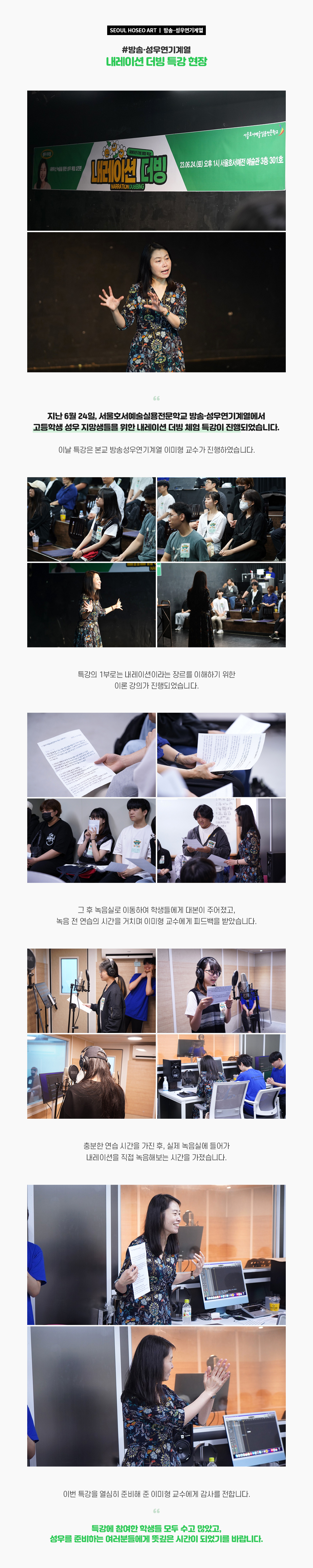 지난 6월 24일, 서울호서예술실용전문학교 방송·성우연기계열에서 고등학생 성우 지망생들을 위한 내레이션 더빙 체험 특강이 진행되었습니다. 이날 특강은 본교 방송·성우연기계열 이미형 교수가 진행하였습니다. 특강의 1부로는 내레이션이라는 장르를 이해하기 위한 이론 강의가 진행되었습니다.