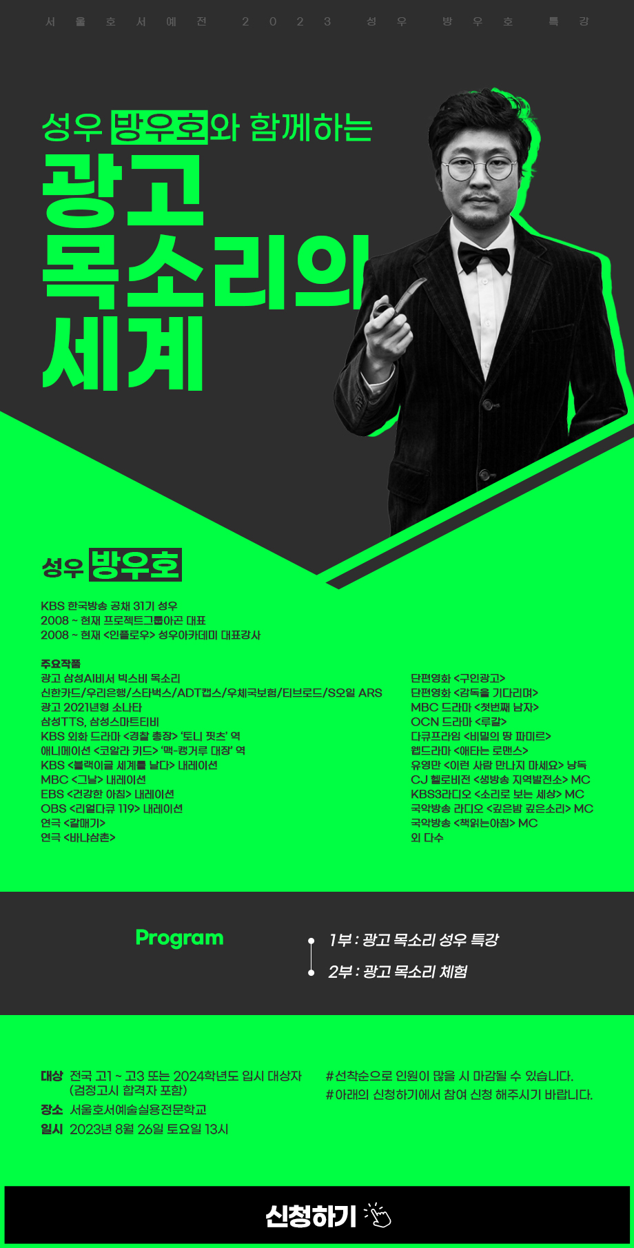서울호서예술실용전문학교 방송·성우연기계열 성우 방우호과 함께하는 광고 목소리의 세계 신청하기
