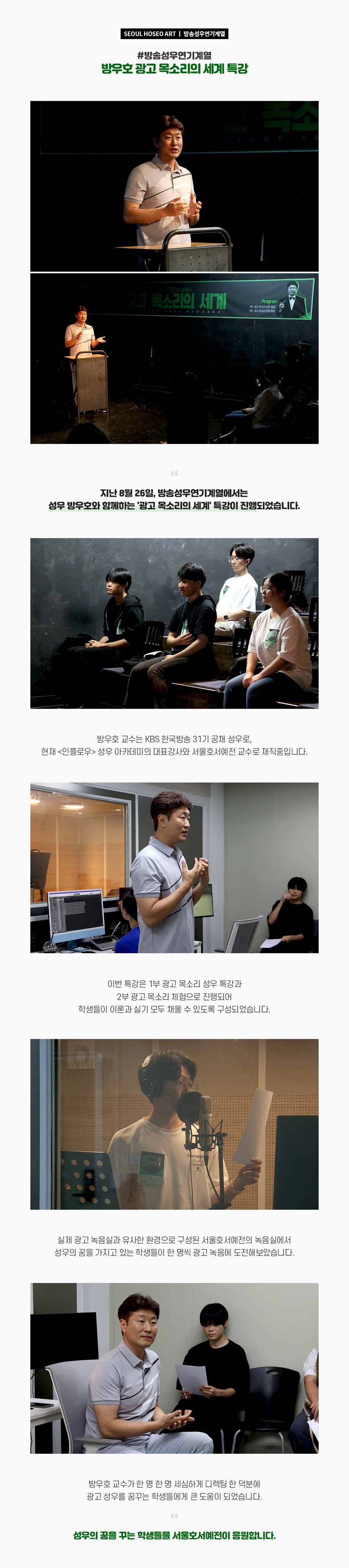 지난 8월 26일, 방송성우연기계열에서는 성우 방우호와 함께하는 '광고 목소리의 세계' 특강이 진행되었습니다. 방우호 교수는 KBS 한국방송 31기 공채 성우로, 현재 <인플로우> 성우 아카데미의 대표강사와 서울호서예전 교수로 재직중입니다.