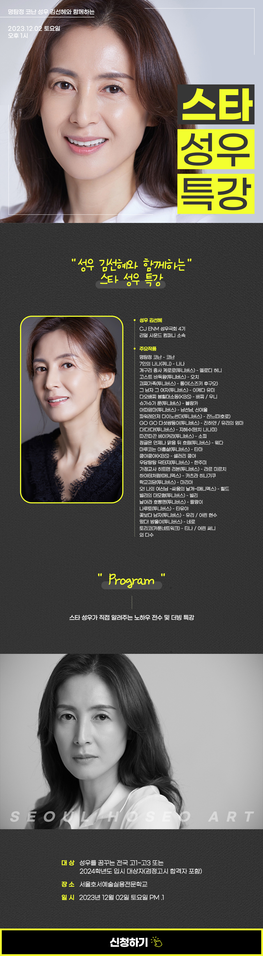 서울호서예술실용전문학교 방송·성우연기계열 2023 성우 김선혜와 함께하는 스타 성우 특강 명탐정 코난 성우가 알려주는 특급 노하우 신청하기