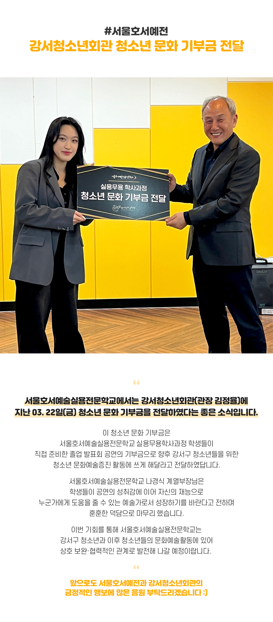 서울호서예술실용전문학교에서는 강서청소년회관(관장 김정율)에 지난 03. 22일(금) 청소년 문화 기부금을 전달하였다는 좋은 소식입니다. 이 청소년 문화 기부금은 서울호서예술실용전문학교 실용무용학사과정 학생들이 직접 준비한 졸업 발표회 공연의 기부금으로 향후 강서구 청소년들을 위한 청소년 문화예술증진 활동에 쓰게 해달라고 전달하였답니다.