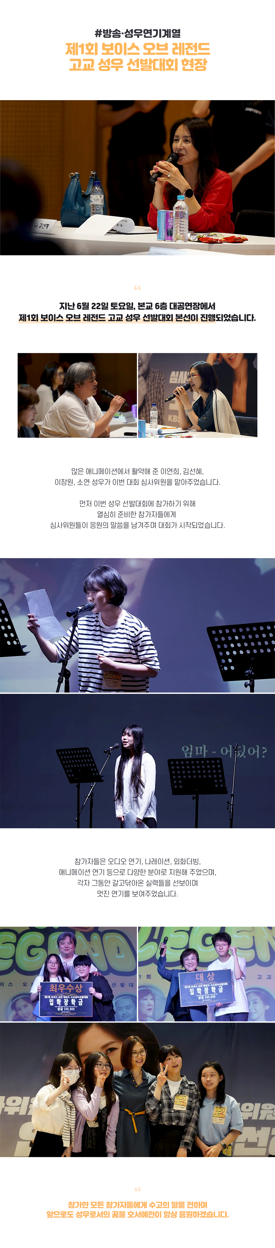 지난 6월 22일 토요일, 본교 6층 대공연장에서 제1회 보이스 오브 레전드 고교 성우 선발대회 본선이 진행되었습니다. 많은 애니메이션에서 활약해 준 이연희, 김선혜, 이장원, 소연 성우가 이번 대회 심사위원을 맡아주었습니다. 먼저 이번 성우 선발대회에 참가하기 위해 열심히 준비한 참가자들에게 심사위원들이 응원의 말씀을 남겨주며, 대회가 시작되었습니다.