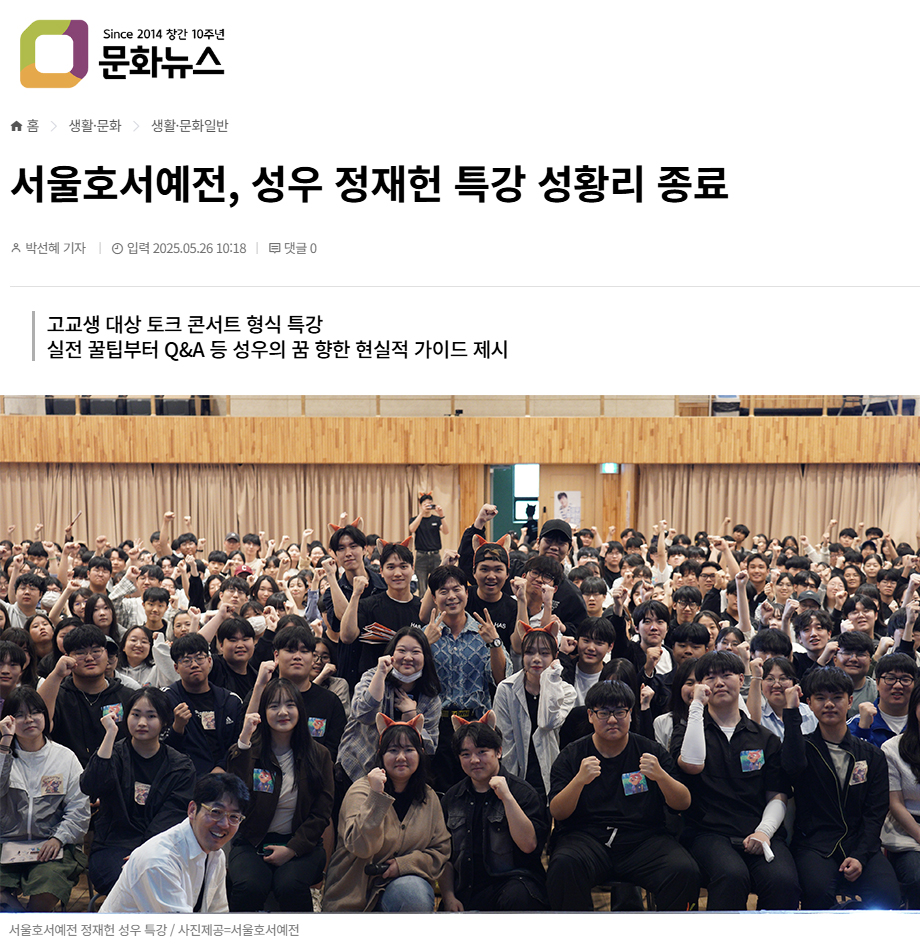 (문화뉴스 박선혜 기자) 서울호서예술실용전문학교(이하 서울호서예전)는 지난 5월 17일 스타성우 정재헌과 함께한 특강이 많은 관심 속에 성공적으로 마무리되었다고 밝혔다.이번 특강은 전국 고등학생을 대상으로 토크 콘서트 형식으로 진행되었다. 정재헌 성우는 자신이 성우의 길을 걷게 된 계기부터, 그 과정에서 겪은 시행착오와 노력 그리고 미래의 성우가 될 학생들에게 진심 어린 조언을 풀어놓으며 참가자들의 공감과 박수를 받았다.