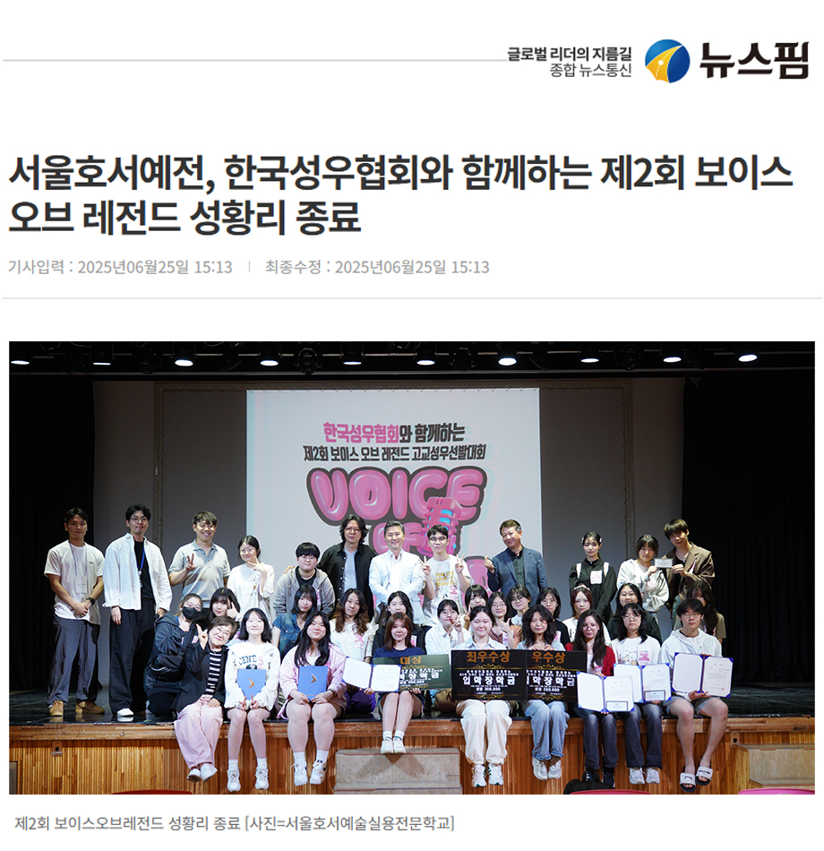 [서울=뉴스핌] 오경진 기자 = 서울호서예술실용전문학교(이하 서울호서예전) 방송·성우 연기 계열에서 지난 6월 21일 토요일 오후 1시, 한국성우협회와 함께하는 '제2회 보이스 오브 레전드' 고교 성우 선발 대회를 성황리에 마무리했다고 밝혔다.