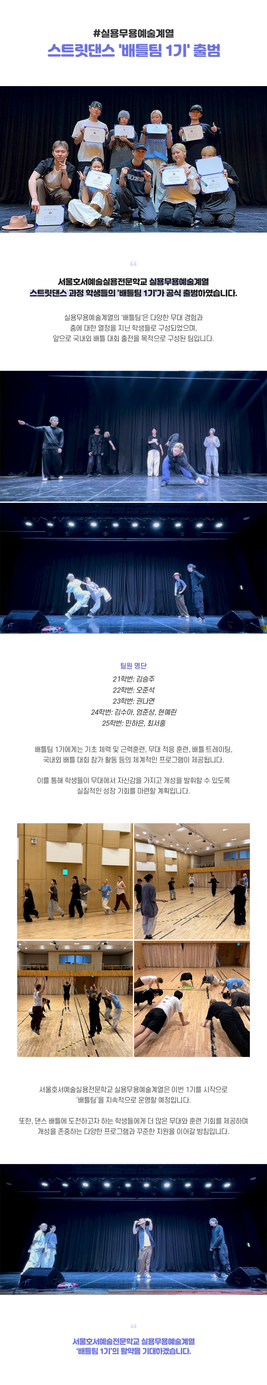 서울호서예술실용전문학교 실용무용예술계열 스트릿댄스 과정 학생들의 '배틀팀 1기'가 공식 출범하였습니다. 실용무용예술계열의 '배틀팀'은 다양한 무대 경험과 춤에 대한 열정을 지닌 학생들로 구성되었으며, 앞으로 국내외 배틀 대회 출전을 목적으로 구성된 팀입니다.