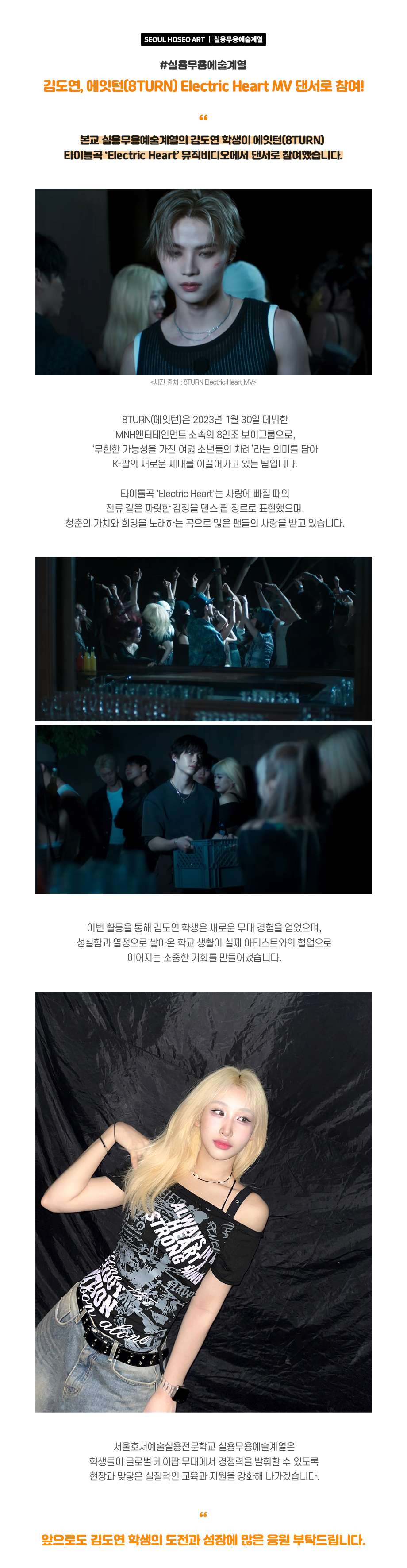 실용무용예술계열 실용무용예술계열의 김도연 학생이 에잇턴(8TURN) 타이틀곡 ‘Electric Heart’ 뮤직비디오에서 댄서로 참여했습니다.