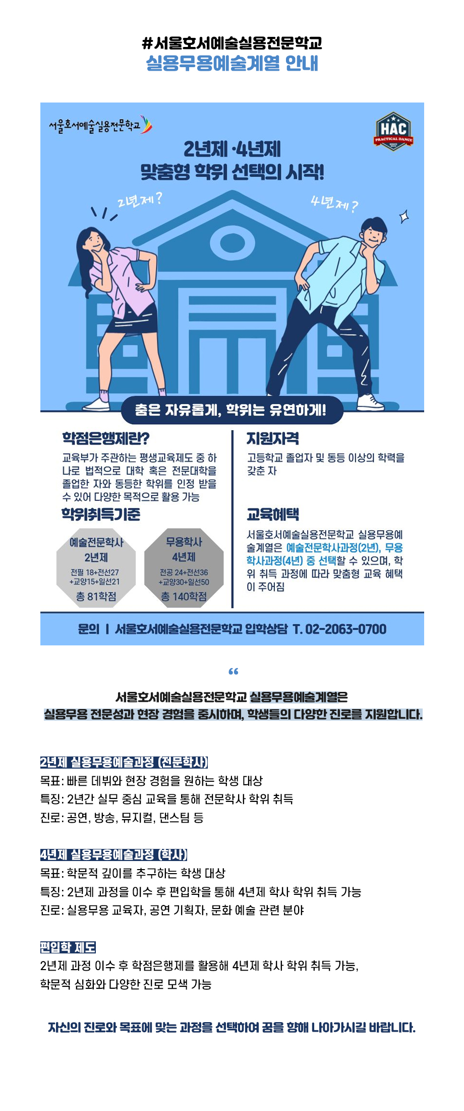 서울호서예술실용전문학교 실용무용예술계열은 실용무용 전문성과 현장 경험을 중시하며, 학생들의 다양한 진로를 지원합니다.
