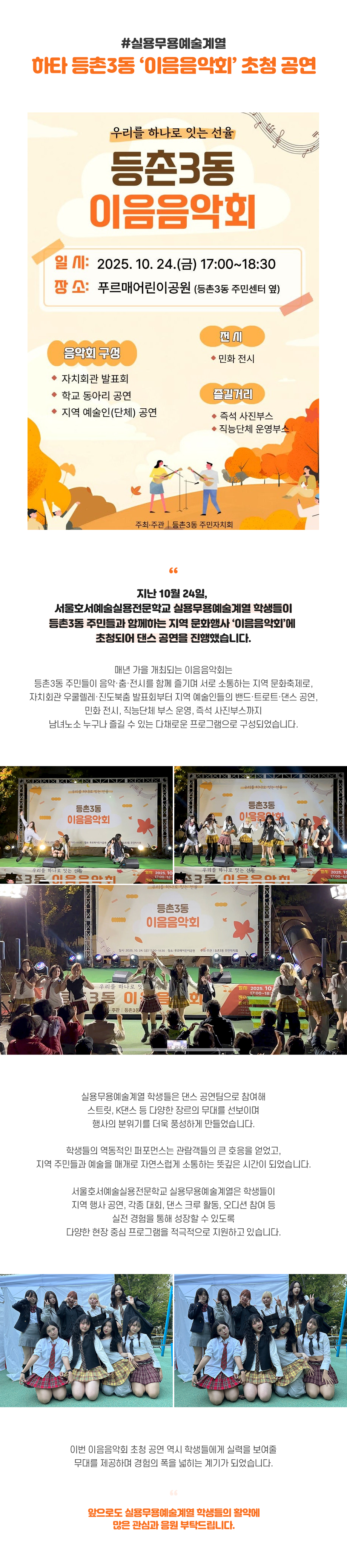 지난 10월 24일, 서울호서예술실용전문학교 실용무용예술계열 학생들이 등촌3동 주민들과 함께하는 지역 문화행사 ‘이음음악회’?에 초청되어 댄스 공연을 진행했습니다.