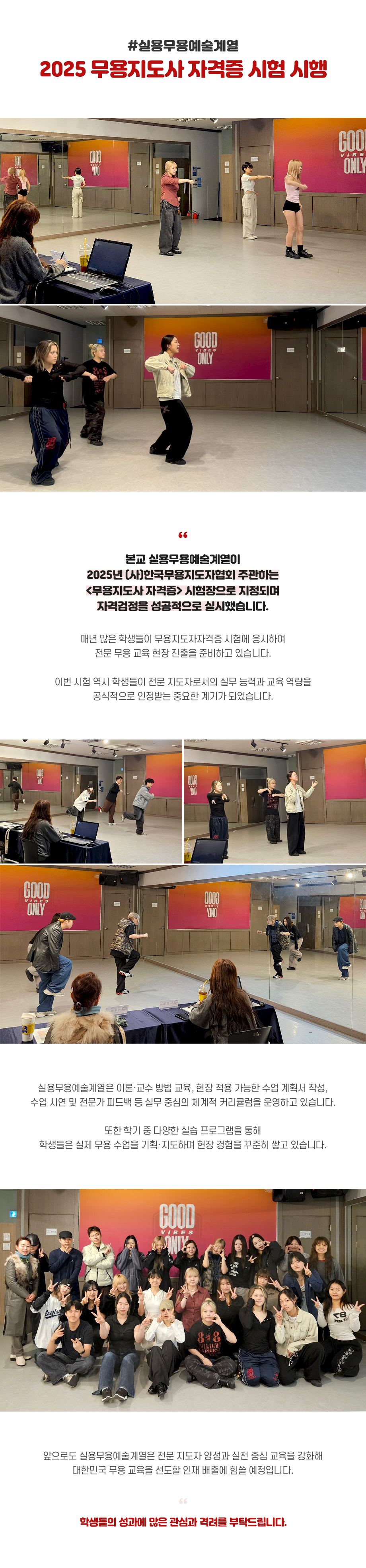 본교 실용무용예술계열이 2025년 (사)한국무용지도자협회 주관하는 <무용지도사 자격증> 시험장으로 지정되며 자격검정을 성공적으로 실시했습니다.