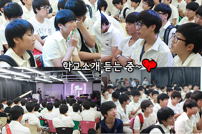 다같이 모여앉아 학교 소개를 듣고 있어요.