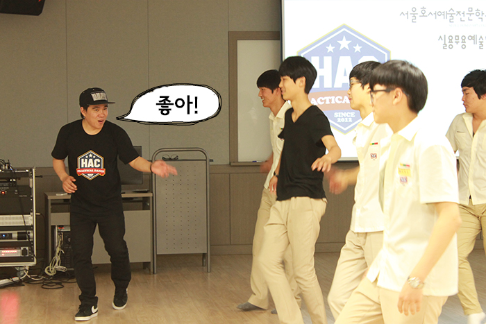 학생들이 금방금방 춤을 몸에 익히니 나경식 교수가 뿌듯해 하고 있어요!