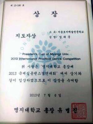 그리고 이번 대회를 지도해주신 엄태준 교수는 명지대 국제실용댄스 경연대회의 지도자상을 수상하였습니다~