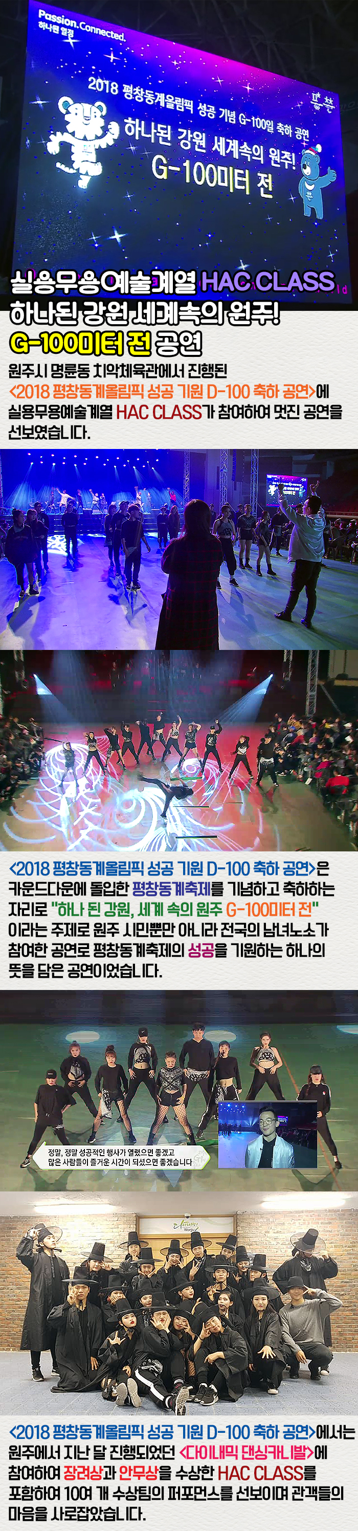 원주시 명륜동 치악체육관에서 진행된 <2018 평창동계올림픽 성공 기원 D-100 축하 공연>에 실용무용예술계열 HAC CLASS가 참여하여 멋진 공연을 선보였습니다.