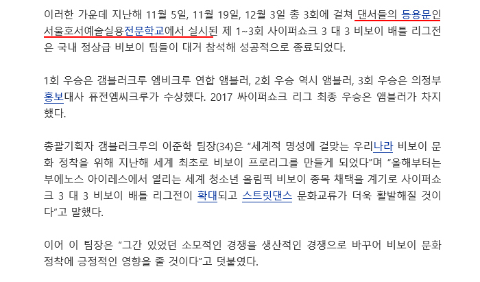 이를 계기로 지난해 최초의 비보이 프로리그, 사이퍼 쇼크(cypher shock) 3 대 3 비보이 배틀 리그전으로 재점화한 대한민국 비보이 문화가 올해는 더욱 확산될 것으로 기대를 모으고 있다.