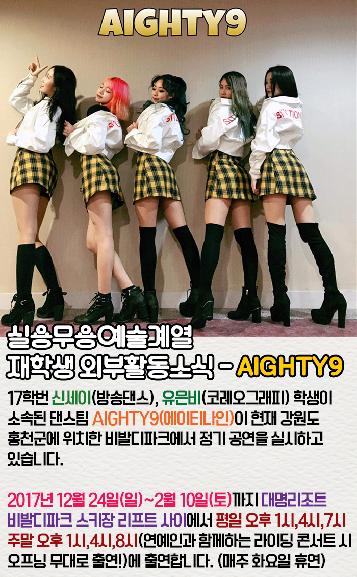 17학번 신세이(방송댄스), 유은비(코레오그래피) 학생이 소속된 댄스팀 AIGHTY9(에이티나인)이 현재 강원호 홍천군에 위치한 비발디파크에서 정기 공연을 실시하고 있습니다.