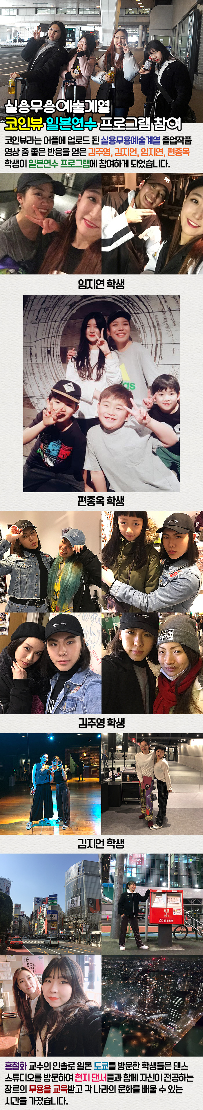 코인뷰라는 어플에 업로드 된 실용무용예술계열 졸업작품 영상 중 좋은 반응을 얻은 김주영, 김지언, 임지연, 편종옥 학생이 일본연수 프로그램에 참여하게 되었습니다.