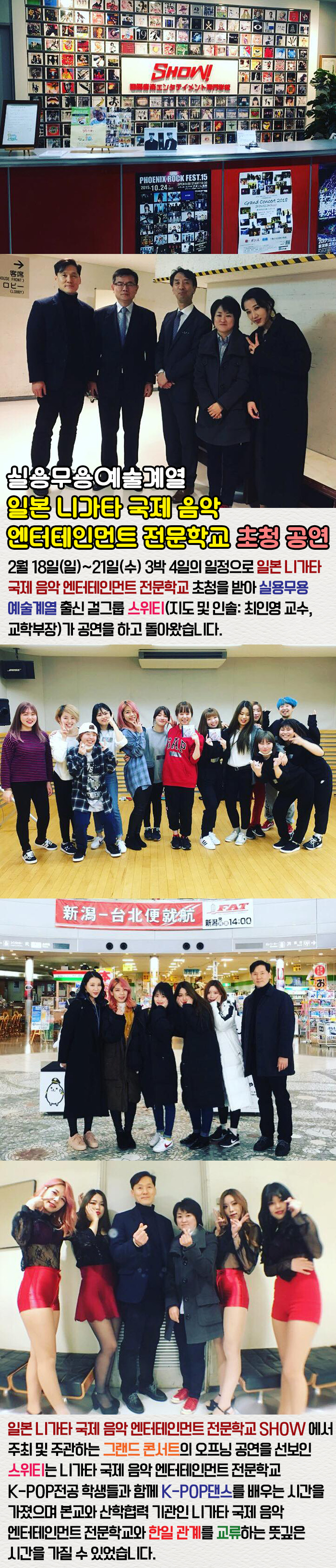 2월 18일(일)~21일(수) 3박 4일의 일정으로 일본 니가타 국제 음악 엔터테인먼트 전문학교 초청을 받아 실용무용예술계열 출신 걸그룹 스위티(지도 및 인솔: 최인영 교수,교학부장)가 공연을 하고 돌아왔습니다.