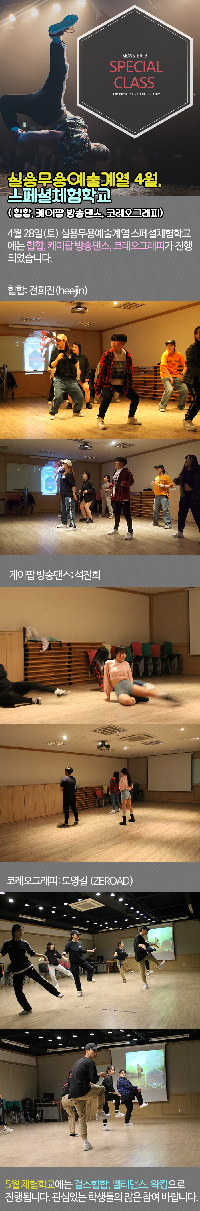 4월 28일(토) 실용무용예술계열 스페셜체험학교에는 힙합, 케이팝 방송댄스, 코레오그래피가 진행되었습니다.