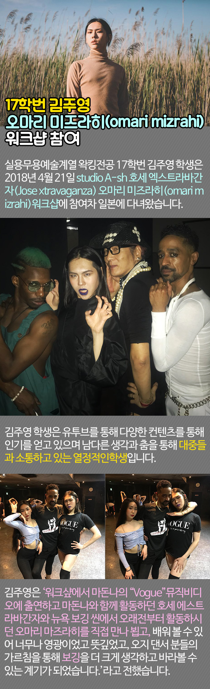실용무용예술계열 왁킹전공 17학번 김주영 학생은 2018년 4월 21일 studio A-sh 호세 엑스트라바간자(Jose xtravaganza) 오마리 미즈라히(omari mizrahi)워크샵에 참여차 일본에 다녀왔습니다.