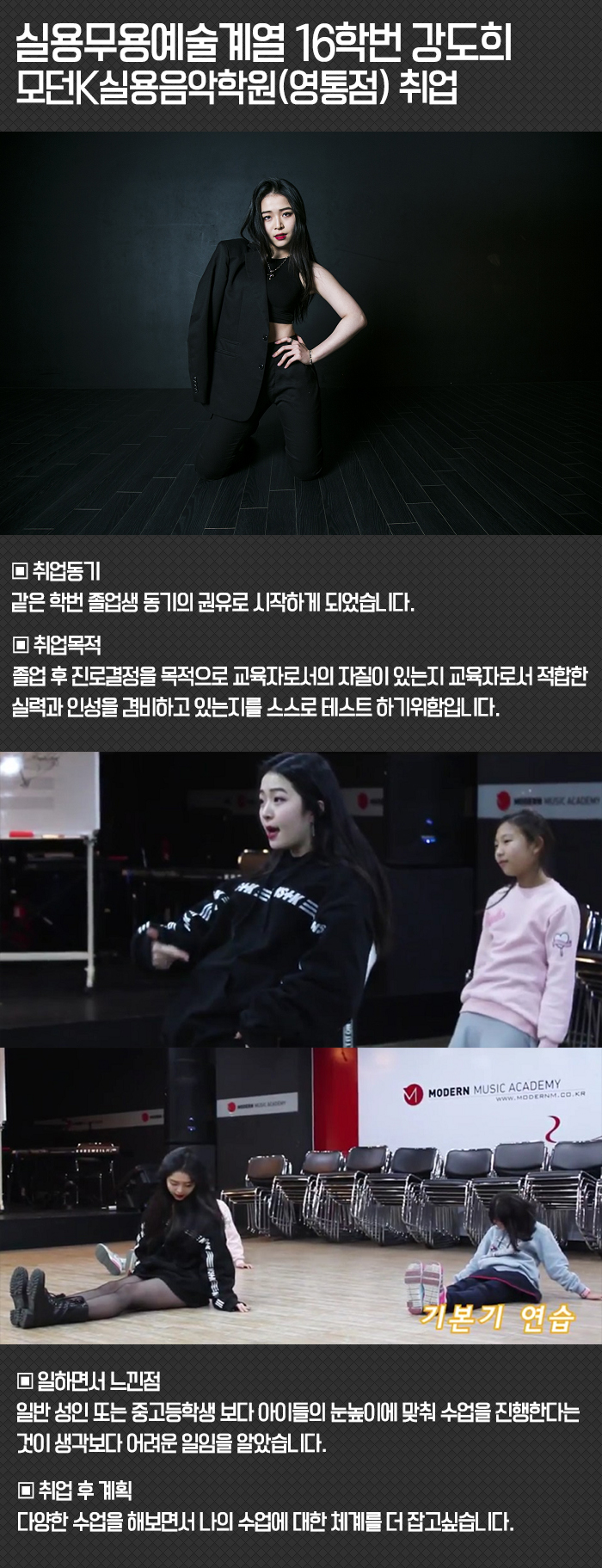 16학번 강도희 학생의 모던K실용음악학원(영통점) 취업 소식을 전해드립니다.