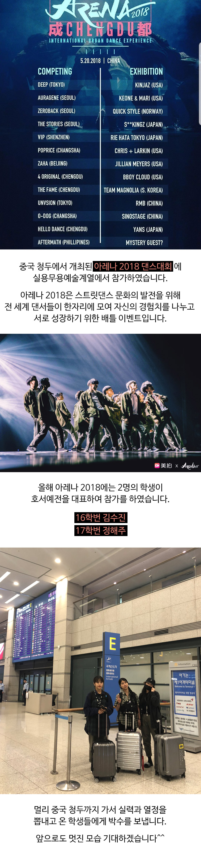 중국 청두에서 개최된 아레나 2018 댄스대회에 실용무용예술계열이 참가하였습니다.