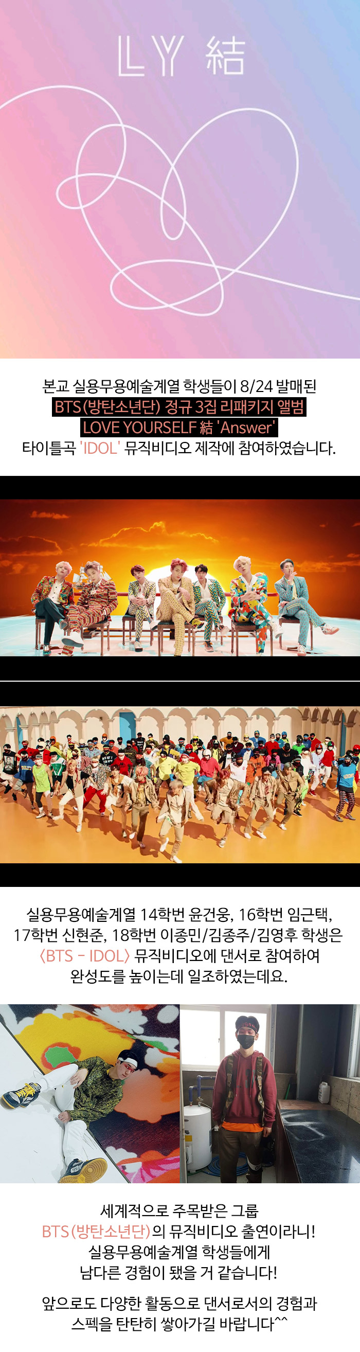 본교 실용무용예술계열& 케이팝계열 학생들이 8/24 발매된 BTS(방탄소년단) 정규 3집 리패키지 앨범 LOVE YOURSELF 結 'Answer' 타이틀곡 'IDOL' 뮤직비디오 제작에 참여하였습니다.