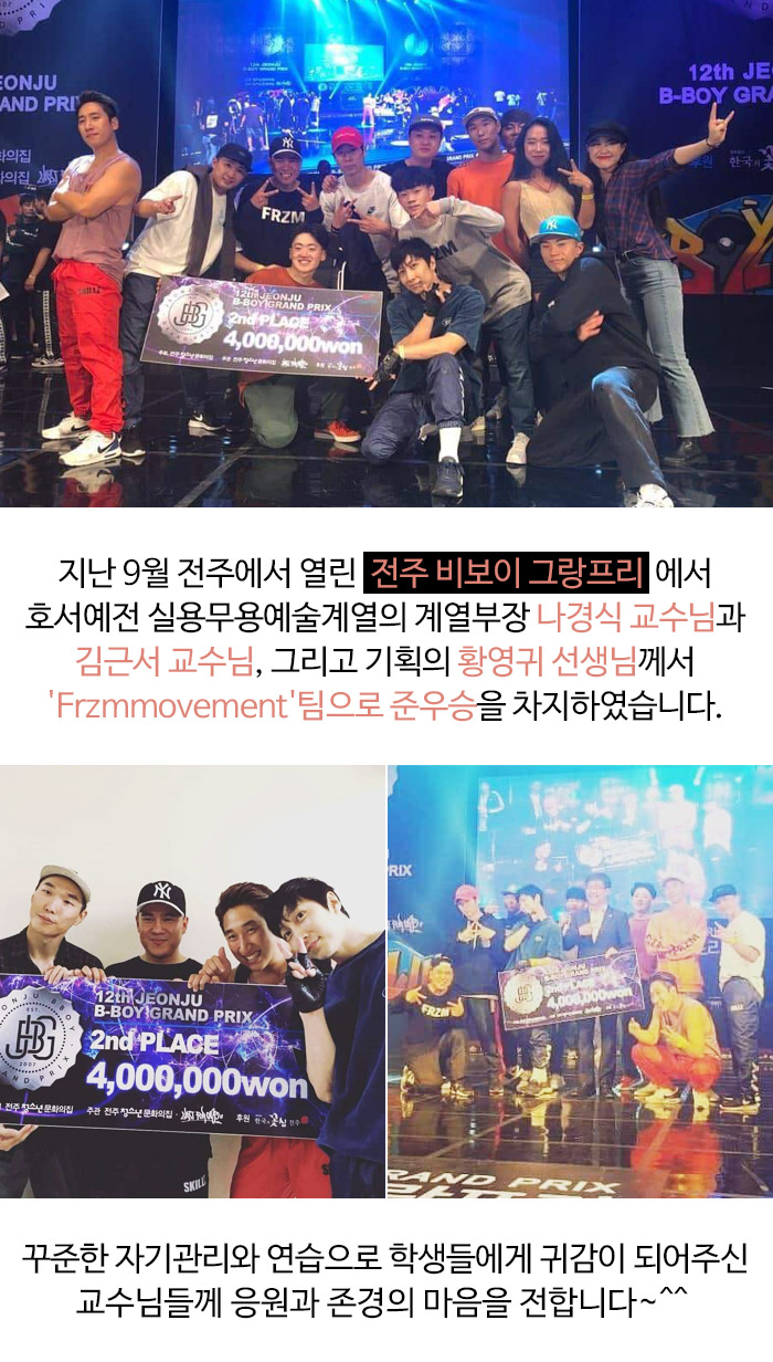 지난 9월 전주에서 열린 전주 비보이 그랑프리에서 호서예전 실용무용예술계열의 계열부장 나경식 교수님과 김근서 교수님, 그리고 기획의 황영귀 선생님께서 'Frzmmovement'팀으로 준우승을 차지하였습니다.