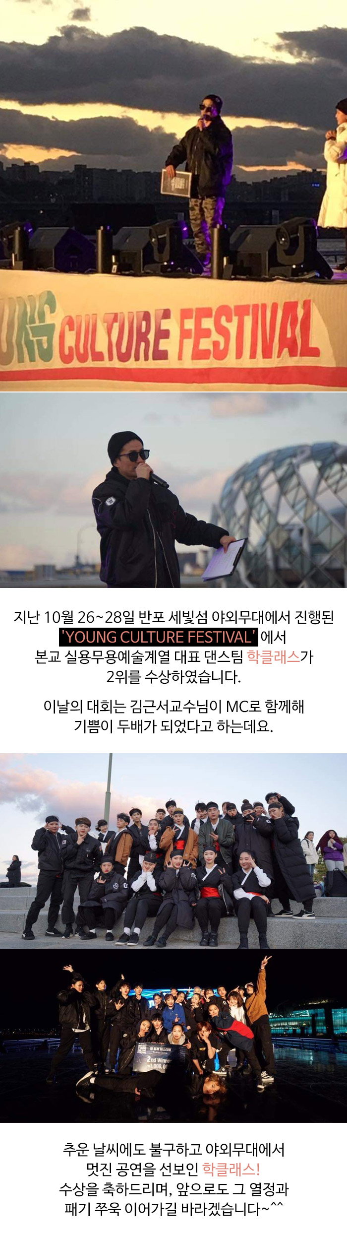 지난 10월 26-28일 반포 세빛섬 야외무대에서 진행된 'YOUNG CULTURE FESTIVAL'에서 본교 실용무용예술계열 대표 댄스팀 학클래스가 2위를 수상하였습니다.