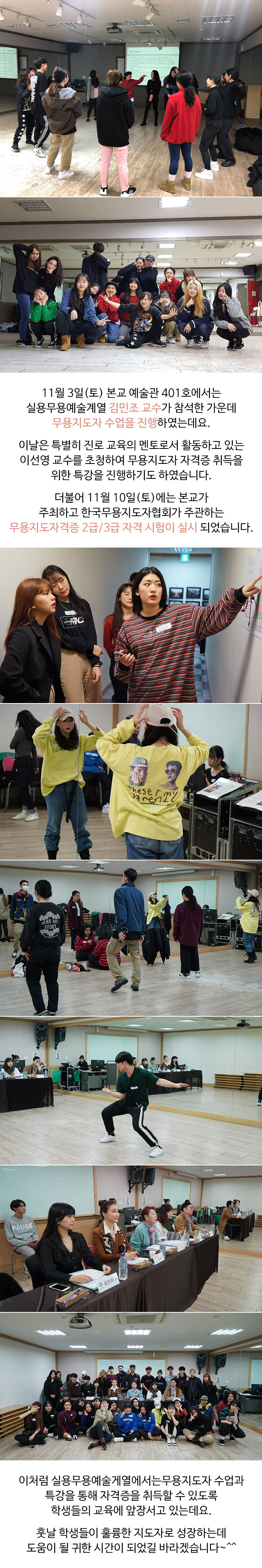 11월 3일(토) 본교 예술관 401호에서는 실용무용예술계열 김민조 교수가 참석한 가운데 무용지도자 수업을