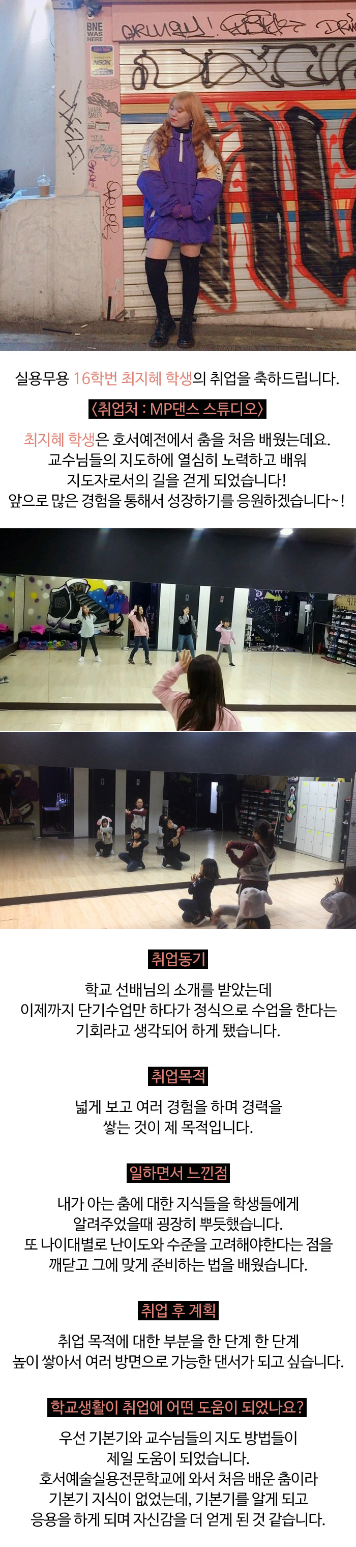 실용무용예술계열 16학번 최지혜학생의 MP댄스 스튜디오 취업!