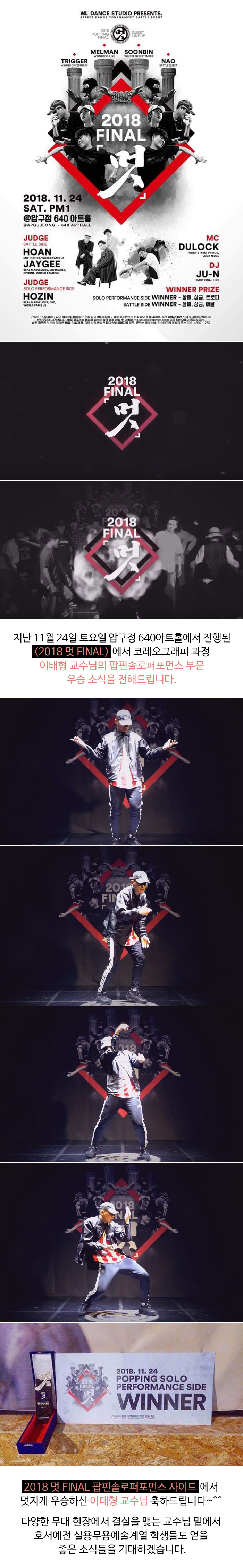 지난 11월 24일 토요일 압구정640아트홀에서 진행된 '2018 멋 FINAL' 에서 코레오그래피 과정 이태형 교수님의 팝핀솔로퍼포먼스 부문 우승 소식을 전해드립니다.
