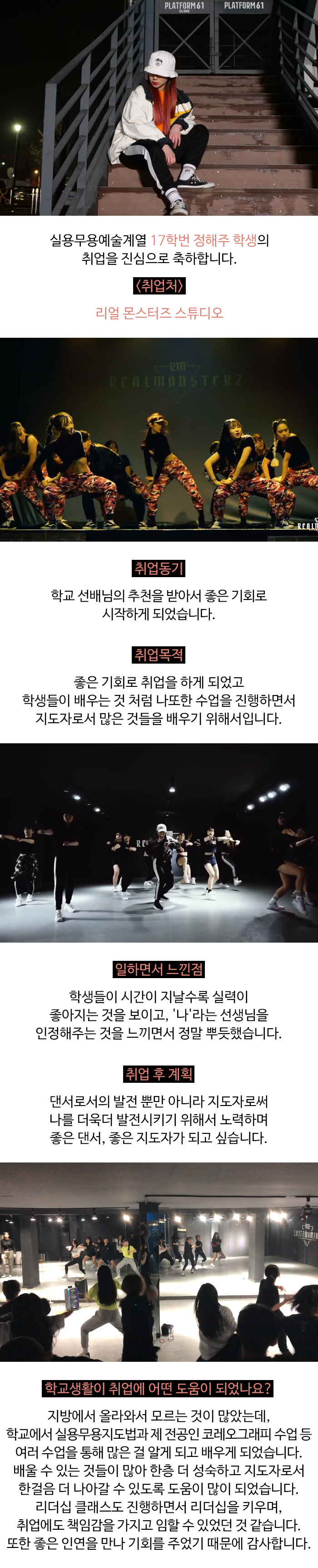 실용무용예술계열 17학번 정해주 리얼 몬스터즈 스튜디오 취업