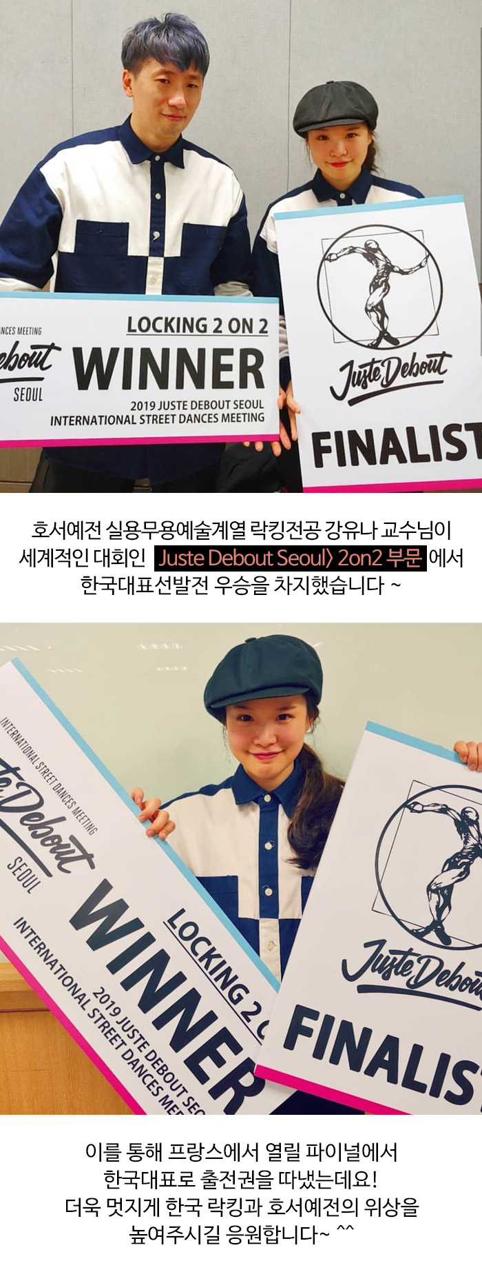 호서예전 실용무용예술계열 락킹전공 강유나 교수님이 세계적인 대회인 "Juste Debout Seoul" 2on2 부문에서 한국대표선발전 우승을 차지했습니다~ ^^