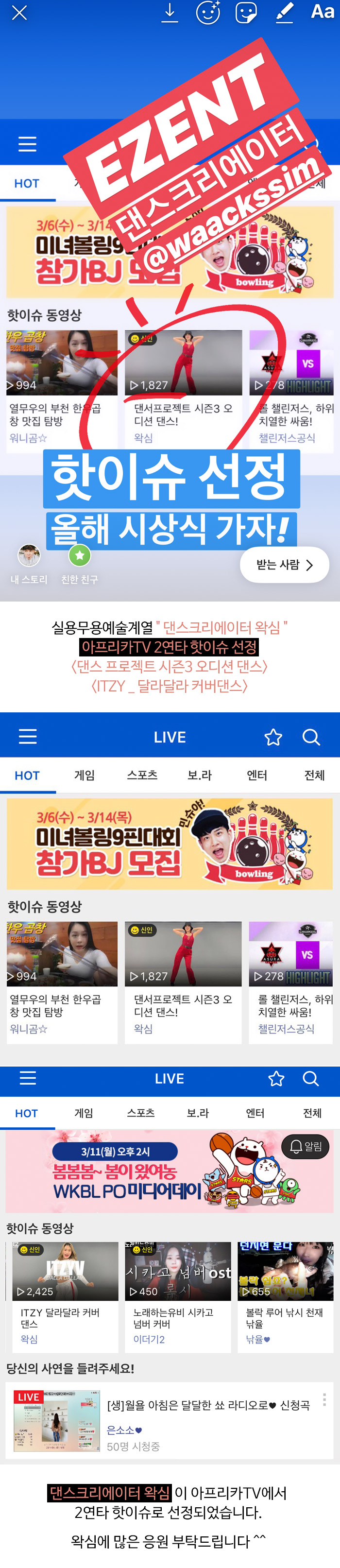 실용무용예술계열 " 댄스크리에이터 왁심 " 아프리카TV 2연타 핫이슈 선정