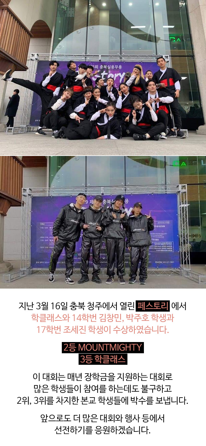 지난 3월 16일 충북 청주에서 열린 페스토리에서 학클래스와 14학번 김창민, 박주호 학생과 17학번 조세진 학생이 수상하였습니다.