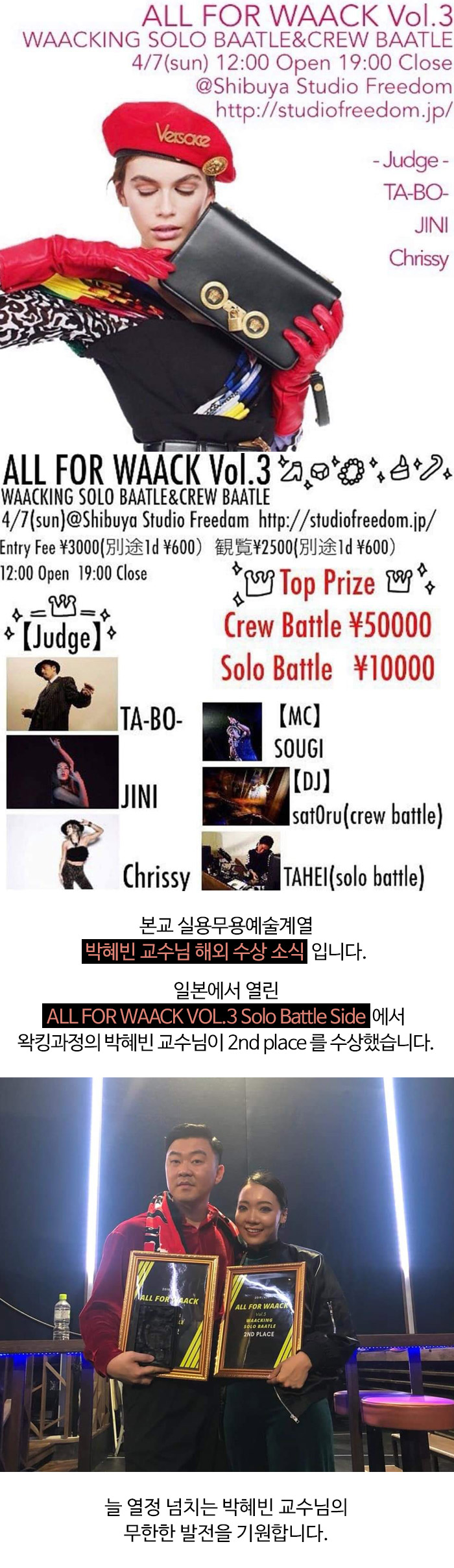 실용무용예술계열 일본 ALL FOR WAACK VOL.3 Solo Battle Side 박혜빈 교수 수상소식