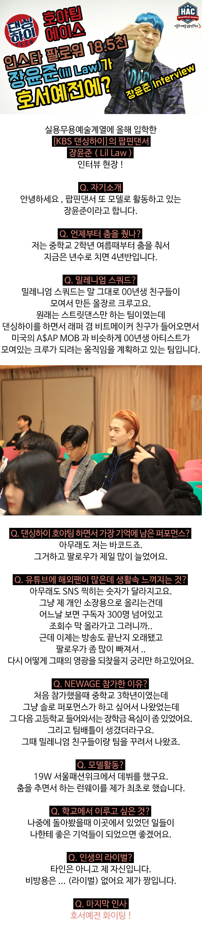 실용무용예술계열에 입학한 [KBS 댄싱하이]의 팝핀댄서 장윤준(Lil Law) 학생의 인터뷰 현장 !