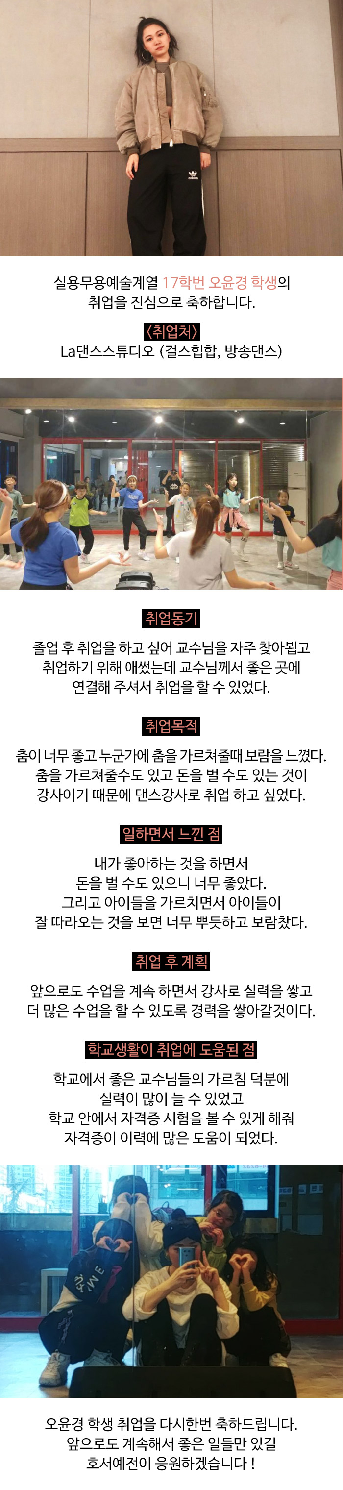 실용무용예술계열 17학번 오윤경 학생의 취업을 축하합니다.