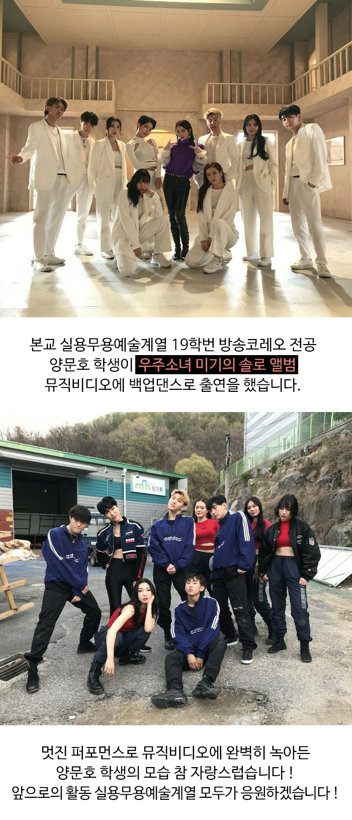 본교 실용무용예술계열 19학번 방송코레오 전공 양문호 학생이 "우주소녀 미기의 솔로 앨범" 뮤직비디오에 백업댄스로 출연을 했습니다.