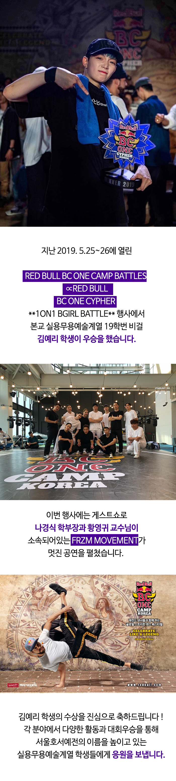 지난 2019. 5.25~26에 열린 RED BULL BC ONE CAMP BATTLES ∝RED BULL BC ONE CYPHER **1on1 BGIRL Battle** 행사에서 본교 실용무용예술계열 19학번 비걸 김예리 학생이 우승을 했습니다.
