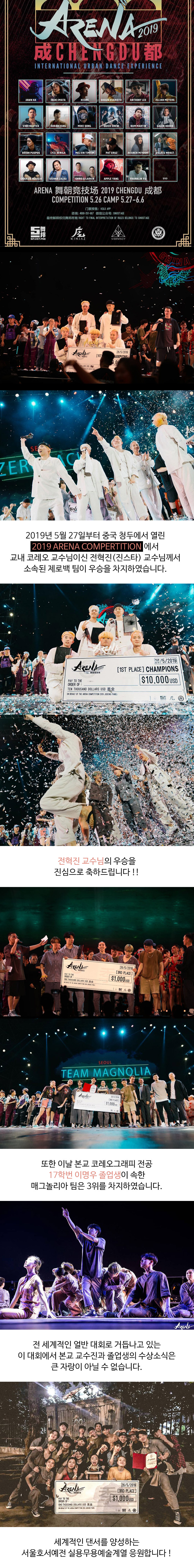 2019년 5월 27일부터 중국 청두에서 열린 2019 ARENA COMPERTITION에서 교내 코레오 교수님이신 전혁진(진스타) 교수님께서 소속된 제로백 팀이 우승을 차지하였습니다.
