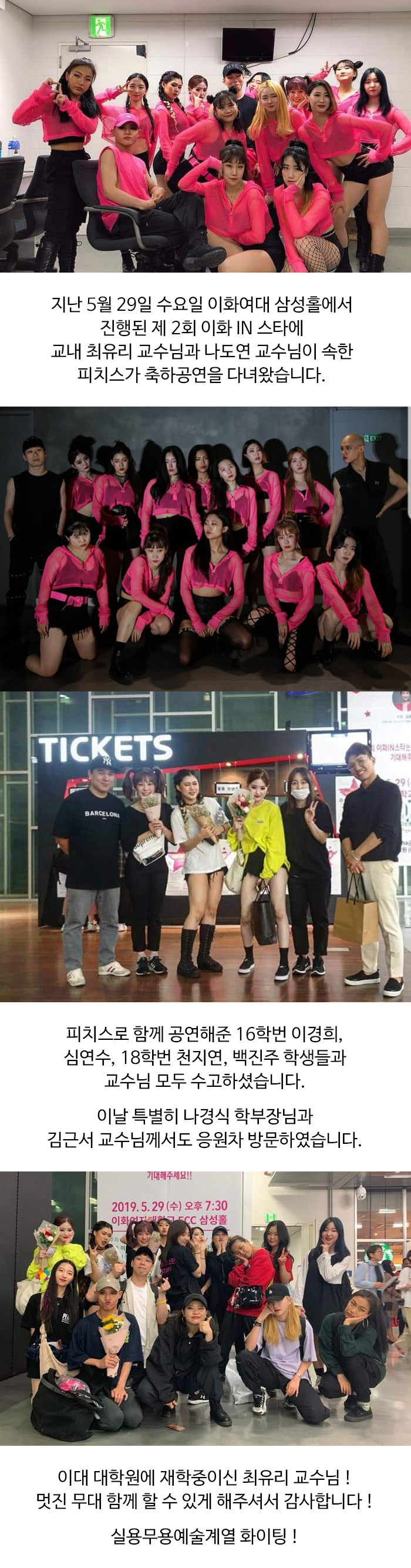 지난 5월 29일 수요일 이화여대 삼성홀에서 진행된 제 2회 이화 IN 스타에 교내 최유리 교수님과 나도연 교수님이 속한 피치스가 축하공연을 다녀왔습니다.