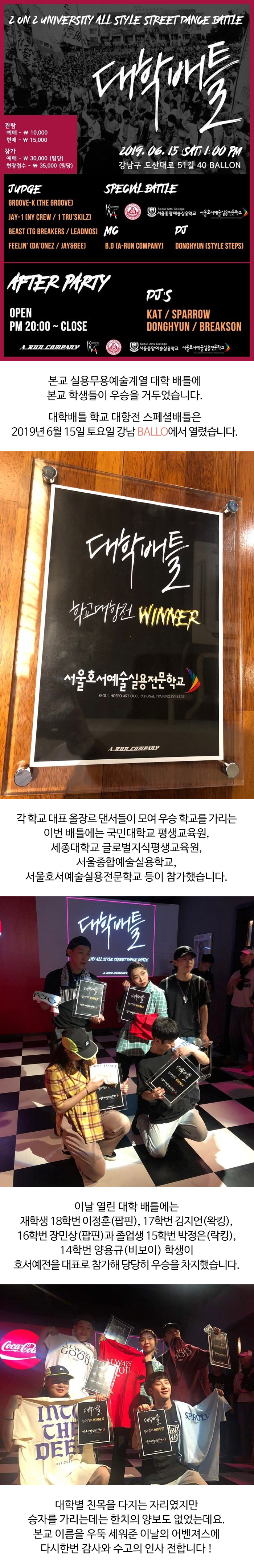 본교 실용무용예술계열 대학 배틀에 본교 학생들이 우승을 거두었습니다.