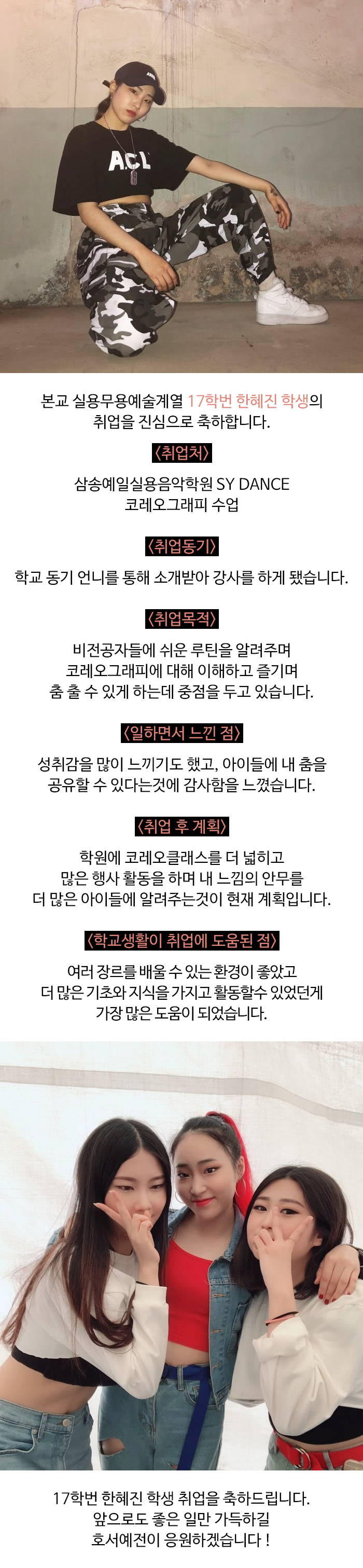 실용무용예술계열 17학번 한혜진 학생의 취업을 진심으로 축하합니다.