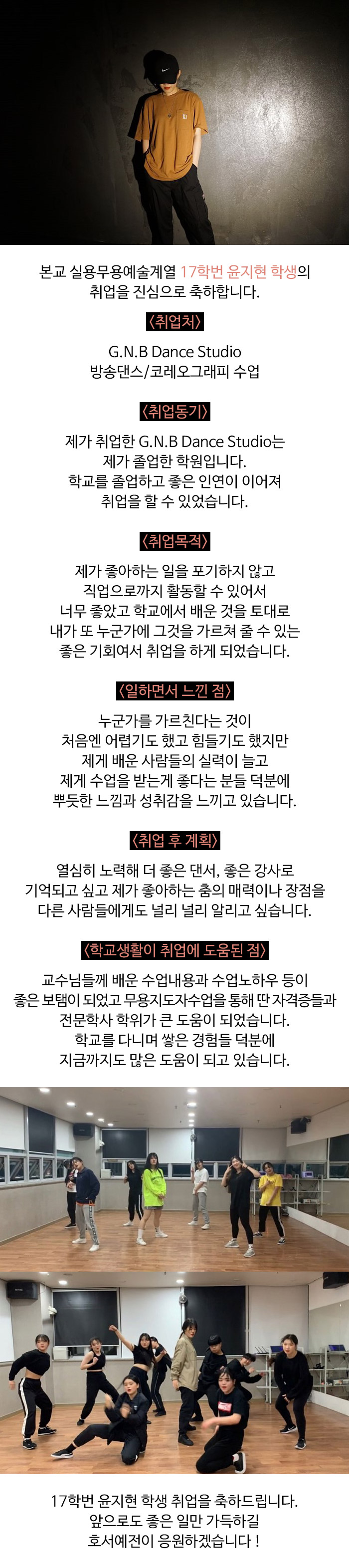 실용무용예술계열 17학번 윤지현 학생 취업을 진심으로 축하합니다! 앞으로도 좋은 일만 가득하길 호서예전이 응원합니다!