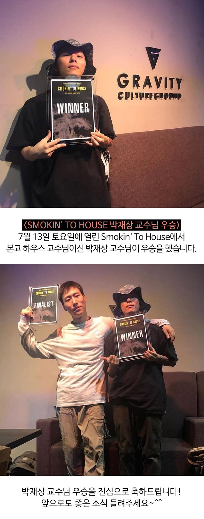 7월 13일 토요일에 열린 Smokin' To House에서 교내 하우스 교수님이신 박재상 교수님이 우승을 했습니다.