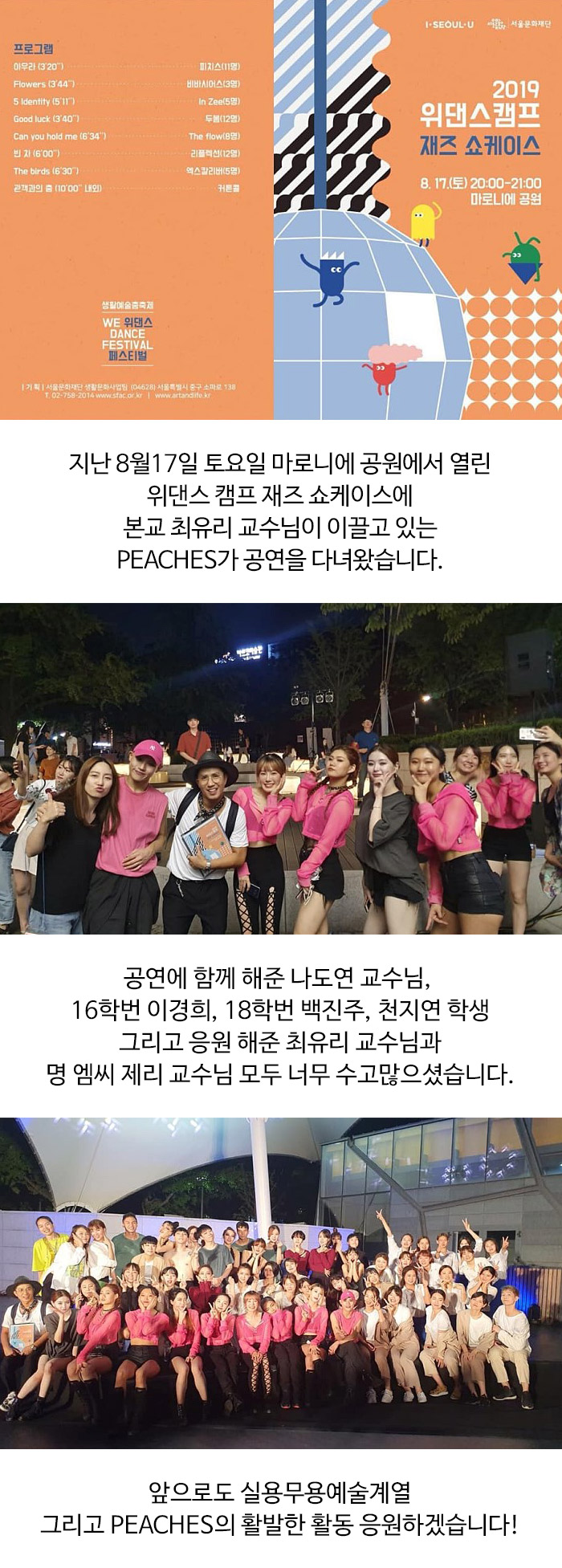 지난 8월17일 토요일 마로니에 공원에서 열린 위댄스 캠프 재즈 쇼케이스에 본교 최유리 교수님이 이끌고 있는 PEACHES가 공연을 다녀왔습니다.